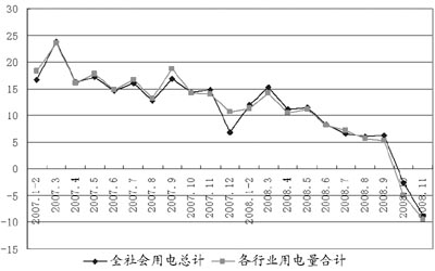 來自電力部門的統(tǒng)計數(shù)據(jù)顯示,11月份全國用電量同比增長-8.33%,這是在10月份用電量增長-2.18%的基礎(chǔ)上出現(xiàn)大幅下滑。有專家預(yù)計,12月份用電量還會繼續(xù)下降。 電力向來被視為國民經(jīng)濟(jì)的“晴雨表”,透過用電量的增長可以準(zhǔn)確把握產(chǎn)業(yè)、行業(yè)的發(fā)展?fàn)顩r及宏觀經(jīng)濟(jì)的走勢。 由國網(wǎng)北京經(jīng)濟(jì)技術(shù)研究院副院長胡兆光博士繪制的一份“2007年以來各月我國全國及各行業(yè)用電量增長速度”圖表(圖1)顯示:全國月度用電量增長率在2007年3月曾高達(dá)23.88%,全行業(yè)(一、二、三產(chǎn))月度用電量增長率也達(dá)到23.48%。此后便呈起伏式下滑,全國用電量10月份同比增長-2.18%,11月份同比增長-8.33%。 “首先,受全球金融危機(jī)影響,我國部分出口行業(yè)的用電量增速下滑最為明顯。”胡兆光說,“特別是嚴(yán)重依賴出口的紡織業(yè)等正在步入衰退期! 記者從他繪制的“2007年以來各月部分出口行業(yè)用電量增長速度”圖表(圖2)中看到,紡織業(yè)的用電增速在2007年基本維持在10%左右,從今年3月份起開始下滑,7月份為-0.4%,8月份為-0.7%,9月份為-0.79%,10月份為-9.49%,11月份達(dá)到-12.34%,已經(jīng)連續(xù)5個月為負(fù)增長。服裝鞋帽及其制品業(yè)和木材加工家具制造業(yè)的用電量也在10月份分別出現(xiàn)-11.17%和-2.98%的負(fù)增長,11月份分別為-7.8%和-14.6%的負(fù)增長。 胡兆光說:“國際金融危機(jī)已經(jīng)直接影響到我國部分行業(yè)的生產(chǎn)經(jīng)營。盡管我國政府在今年下半年陸續(xù)調(diào)整出口退稅政策,但從目前看很難扭轉(zhuǎn)這種下滑的局面! “其次,受國內(nèi)市場影響較大的黑色、有色行業(yè)的用電量也呈現(xiàn)大幅度下降!焙坠飧嬖V記者,黑色、有色行業(yè)的用電量增長今年10月份分別為-16%及-8.9%,到11月份更分別降至-24.5%及-14.5%。(圖3)他說:“黑色、有色行業(yè)的發(fā)展與房地產(chǎn)有直接的關(guān)聯(lián)。房地產(chǎn)業(yè)的不景氣導(dǎo)致對鋼材、鋁等產(chǎn)品的需求不旺!贝送猓衲10月份用電負(fù)增長的行業(yè)還有:印刷、文體用品制造業(yè)用電增速分別為-6.5%和-10.5%;化工業(yè)為-8.57%,其中氯堿為-28.9%,電石為-27.7%;醫(yī)藥制造、化纖制造、橡膠塑料制造業(yè)也是負(fù)增長。11月份用電負(fù)增長的行業(yè)已擴(kuò)大到采礦業(yè)為-12.5%,及占全國當(dāng)月用電量的一半的制造業(yè)中的20個行業(yè)均為負(fù)增長。但建筑、交通、信息服務(wù)、住宿餐飲、服務(wù)及機(jī)關(guān)等行業(yè)用電增速還是正的。 |