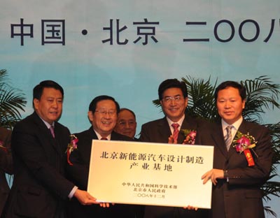 2008年12月28日,北京新能源汽車產(chǎn)業(yè)基地落戶北汽福田汽車公司,這是國內(nèi)首個新能源汽車產(chǎn)業(yè)基地。圖為全國政協(xié)副主席、科技部部長萬鋼(左二)和北京市市長郭金龍(右二)向北汽控股公司董事長徐和誼(左一)和福田公司總經(jīng)理王金玉(右一)授予產(chǎn)業(yè)基地牌匾。