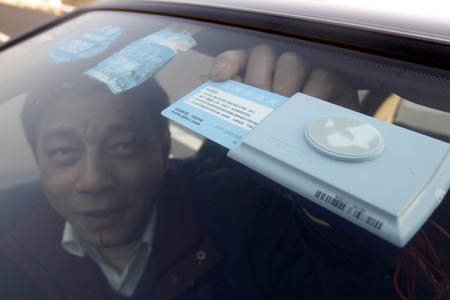 2008年12月31日,長(zhǎng)三角(江蘇、上海)高速公路電子不停車收費(fèi)系統(tǒng)舉行開通儀式。圖為一名司機(jī)使用車內(nèi)安裝的ETC收費(fèi)系統(tǒng)。