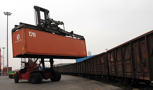 1月8日,在天津港港區(qū),大陸橋集裝箱班列在裝運集裝箱貨物。 記者從天津港了解到,2008年天津港完成大陸橋集裝箱運量近11萬標(biāo)準(zhǔn)箱,同比增長25%,成為集裝箱運量增長的新亮點。據(jù)了解,作為國內(nèi)沿海港口開行最早、運量最大、運距最短的亞歐大陸橋運輸線路港口,天津港2008年又開通了內(nèi)蒙古滿洲里過境集裝箱班列,成為中國唯一擁有亞歐大陸橋全部三條通道的港口。 | |