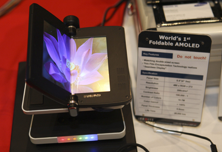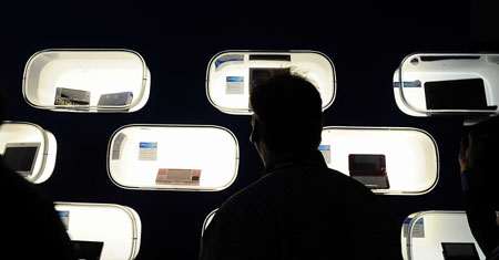 參觀者在英特爾公司展臺(tái)觀看英特爾推出的移動(dòng)上網(wǎng)設(shè)備。