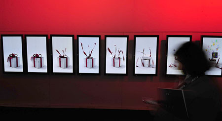 參觀者在體驗(yàn)美國(guó)NBC電視臺(tái)與微軟公司共同推出的桌面屏幕。