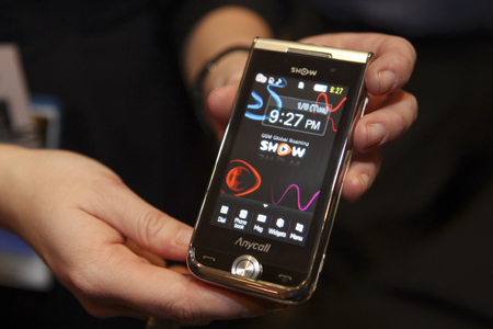 工作人員展示韓國(guó)三星公司開(kāi)發(fā)的一款可作為投影儀使用的手機(jī)。 |
