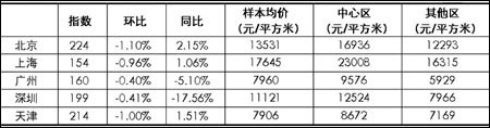 根據(jù)中原領(lǐng)先指數(shù)系統(tǒng)顯示,2008年12月五大主要城市二手住宅價(jià)格繼續(xù)下跌,但跌幅有所減小。廣州深圳僅出現(xiàn)0.4%左右的下跌幅度;北京、上海和天津指數(shù)仍保持1%左右的幅度繼續(xù)下跌。