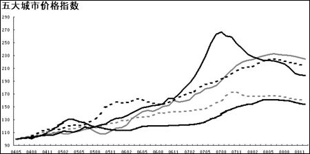 五大城市中原領(lǐng)先指數(shù)月度走勢(shì)圖(2004年5月-2008年12月)