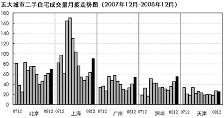 繼上月成交量小幅回升后,2008年12月五大城市二手住宅成交量仍保持了上升的態(tài)勢(shì)。得益于救市政策的頻繁出臺(tái),原本淡季的12月份成交量不降反升,且是在前兩個(gè)月已經(jīng)連續(xù)上升的基礎(chǔ)上,表明救市政策的效果明顯。