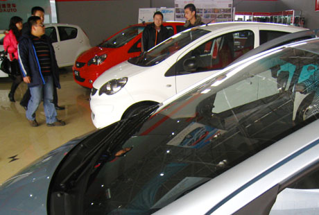 春節(jié)期間,烏魯木齊眾多汽車銷售公司的小排量汽車銷售繼續(xù)走強。圖為1月31日,顧客在烏魯木齊一家汽車銷售店里挑選小排量汽車。本報記者 趙戈 攝