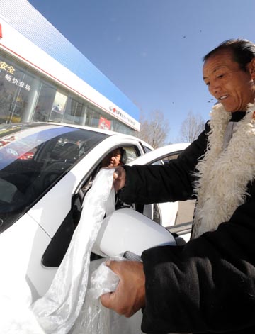 春節(jié)期間,前往拉薩汽車銷售市場購車和咨詢的人絡繹不絕,銷售商也打出不少優(yōu)惠來促進消費,拉薩節(jié)日汽車市場呈現(xiàn)購銷兩旺的局面。圖為1月27日,拉薩市民米瑪在汽車銷售市場給剛買的新車獻哈達。本報記者:格桑達瓦 攝