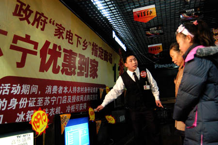 日前,貴州省暨貴陽市家電下鄉(xiāng)儀式在貴陽市烏當(dāng)區(qū)蘇寧電器家電下鄉(xiāng)銷售網(wǎng)點(diǎn)舉行,銷售人員給前來購買彩電的農(nóng)民介紹產(chǎn)品。由此,貴州省正式啟動家電下鄉(xiāng)工作,全省共有20家企業(yè)取得銷售家電下鄉(xiāng)產(chǎn)品資格,確保每個縣的農(nóng)民就近購買到財(cái)政補(bǔ)貼類家電產(chǎn)品。