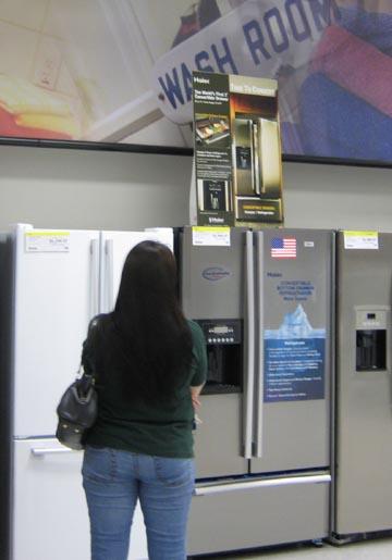 在美國得克薩斯州的Coon’S超市里,海爾美式對開門冰箱(右側(cè))與LG冰箱同臺(tái)競技。 |