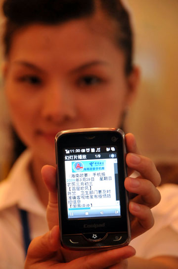 日前,中國電信海南公司3G試商用發(fā)布會在海南省?、三亞、瓊海、儋州四市同時進行,標志著海南3G業(yè)務正式啟動,海南首批近百名3G用戶誕生。 自2009年1月7日國家正式發(fā)放3G牌照以來,海南電信經(jīng)過近三個月的努力使海南的3G網(wǎng)絡基本建成并具備了試商用條件。到目前為止,海南電信3G網(wǎng)絡共投入建設資金近六億元,無線寬帶網(wǎng)絡已覆蓋到全省18個市縣的主要城區(qū),東線高速已全程覆蓋,預計到今年5月中旬,3G網(wǎng)絡將覆蓋海南省所有鄉(xiāng)鎮(zhèn)。圖為工作人員展示手機3G業(yè)務中的“海南政要手機報”。 |