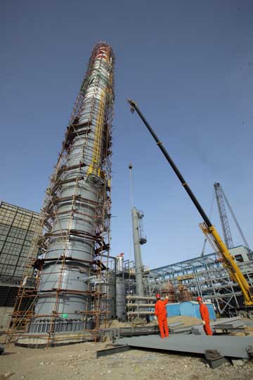 目前,設(shè)計(jì)年產(chǎn)80萬噸尿素的中石油塔里木油田化肥項(xiàng)目正在加緊施工,預(yù)計(jì)將于2009年10月投料試車。該項(xiàng)目的建成將提高塔里木油田石化產(chǎn)品的附加值,為新疆乃至全國的農(nóng)業(yè)生產(chǎn)提供更堅(jiān)實(shí)的生產(chǎn)資料保障。圖為塔里木油田員工在大化肥項(xiàng)目工地施工。