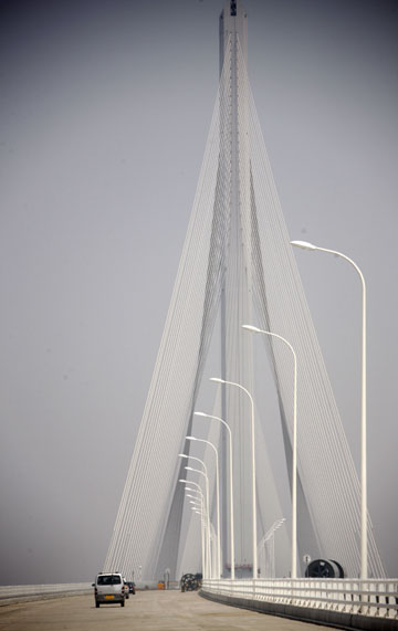 國家“十一五”重大建設(shè)項目上海長江隧橋工程目前已進入后期施工階段,預(yù)計將于2009年年底前建成通車。 上海長江隧橋工程于2004年12月28日正式啟動。該工程由長江隧道和長江大橋組成。長江隧道南起浦東五號溝,穿越長江到達長興島,再通過長江大橋連接崇明島,北止于崇明陳家鎮(zhèn),全長約25.5公里,其中,長江隧道長約8.9公里,長江大橋長約10.3公里。圖為一輛汽車正從上海長江大橋的主塔下經(jīng)過。
