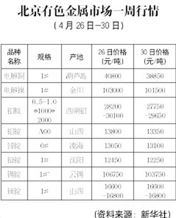 北京有色金屬市場(chǎng)一周行情[04.26-04.30]