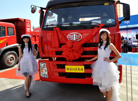 6月2日,模特在展示卡車(chē)。當(dāng)日,首屆中國(guó)(太原)國(guó)際卡車(chē)展在山西省展覽館開(kāi)展,來(lái)自國(guó)內(nèi)外卡車(chē)行業(yè)的20余家領(lǐng)軍企業(yè)參展,吸引了眾多的客商和參觀者。展會(huì)上,我國(guó)卡車(chē)工業(yè)發(fā)展的新技術(shù)、新設(shè)備以及在新能源利用和節(jié)能環(huán)保方面的成就得到充分展示。