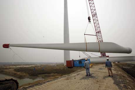 6月2日,工人們正在江蘇如東風(fēng)電特許權(quán)二期項(xiàng)目吊裝電機(jī)組的葉片。2008年,如東風(fēng)電場風(fēng)機(jī)平均可利用率達(dá)到98.93%,為同類機(jī)型全球最高。截至今年5月底,該項(xiàng)目已累計(jì)發(fā)電近9億千瓦時,相當(dāng)于節(jié)約標(biāo)準(zhǔn)煤34萬噸,節(jié)水180萬噸。