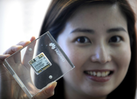 6月2日,全球第二大電腦展——臺(tái)北國(guó)際電腦展開(kāi)幕,共有1700余家廠商參展。展會(huì)首次設(shè)置的“海峽兩岸區(qū)”有清華同方、華為、萬(wàn)利達(dá)等大陸知名企業(yè)參展,共設(shè)80個(gè)展位。圖為工作人員展示華為技術(shù)有限公司最新開(kāi)發(fā)的上網(wǎng)卡(模塊)。