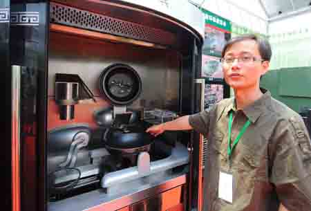 6月14日,2009中國北京國際節(jié)能環(huán)保展覽會開幕。本屆展覽的主題是“綠色產(chǎn)業(yè)、綠色消費”。圖為一名工作人員在介紹一臺名為“烹飪機器人”的機器。