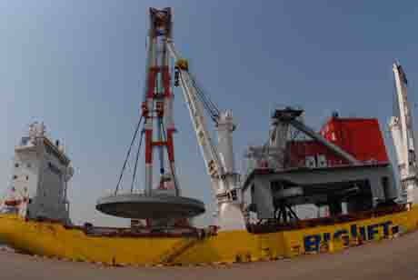 6月15日,在天津港一座碼頭,一臺大型港口起重機正在將一件600噸重的圓盤采油設(shè)備過駁荷蘭籍“幸?燔嚒碧栘涊啞 當(dāng)日,天津港成功將分別重達1200噸和600噸采油設(shè)備過駁荷蘭籍“幸?燔嚒陛。由中國海洋石油工程有限公司制造并出口荷蘭的1200噸海上石油鉆井平臺核心構(gòu)件長36.64米、寬26.35米、高23.34米。這是天津港有史以來出口的最大、最重國產(chǎn)設(shè)備。新華社發(fā)