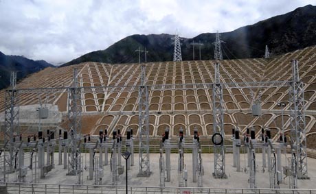 由于國(guó)家投資力度的加大,西藏以雅魯藏布江支流上建設(shè)電站為主的水電建設(shè)進(jìn)入高峰。目前,西藏已經(jīng)建成藏中電網(wǎng)、林芝電網(wǎng)、昌都電網(wǎng)和獅泉河電網(wǎng)4個(gè)區(qū)域性電網(wǎng),到2008年底全區(qū)電力裝機(jī)容量達(dá)71.6萬(wàn)千瓦,年發(fā)電量18.45億千瓦。圖為西藏林芝地區(qū)雪卡水電站變電站一角。 |