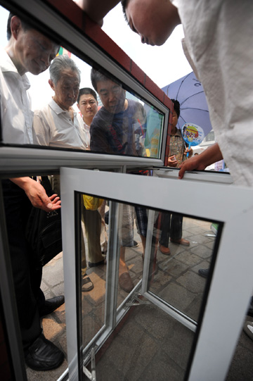 上圖為市民觀看一新式的太陽能電熱水器。 下圖為市民觀看一鋼窗節(jié)能改造技術(shù)的展示。 |