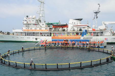 我國向南海投放700多萬尾海洋生物種苗。6月29日,由農(nóng)業(yè)部漁業(yè)局主辦的“2009年北部灣海洋生物資源增殖放流活動”在三亞灣鳳凰島上舉行。這是工作人員正在放流圈養(yǎng)的鯨鯊。漁業(yè)增殖放流是把原產(chǎn)區(qū)優(yōu)良經(jīng)濟(jì)魚類、蝦類、貝類等苗種,投放于適當(dāng)?shù)暮S,從而保持海洋生物資源生態(tài)平衡。