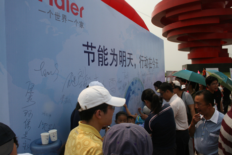 海爾空調(diào)節(jié)能行動(dòng)引起共鳴,其簽名墻上逾千市民留言。 新華社記者