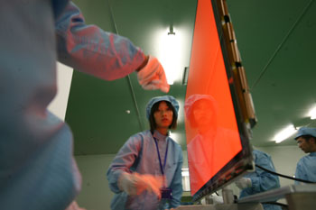 長虹新型等離子顯示屏后端工序?qū)W⒌膯T工。(資料照片) |