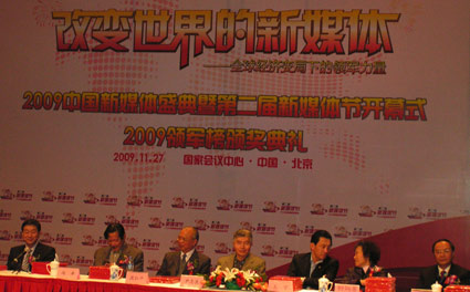中國(guó)新媒體領(lǐng)軍榜”的評(píng)選活動(dòng),經(jīng)過(guò)社會(huì)調(diào)查、組委會(huì)初評(píng)、參評(píng)單位提交資料審核、專家委員會(huì)評(píng)審等環(huán)節(jié),華聲在線、人民網(wǎng)、新華網(wǎng)、央視網(wǎng)、百度、網(wǎng)易、騰訊、新浪、搜狐、鳳凰網(wǎng)等十家國(guó)內(nèi)知名網(wǎng)站獲得了“2009中國(guó)(網(wǎng)絡(luò))新媒體十大領(lǐng)軍品牌”殊榮,華聲在線董事長(zhǎng)薛伯清、新浪CEO曹國(guó)偉、網(wǎng)易CEO丁磊、人民網(wǎng)總裁何加正、華視傳媒董事局主席兼首席執(zhí)行官李利民、漢王科技董事長(zhǎng)劉迎建、中文在線董事長(zhǎng)兼總裁童之磊、央視網(wǎng)總裁汪文斌、優(yōu)視動(dòng)景CEO余永福、搜狐董事局主席兼CEO張朝陽(yáng)等業(yè)界精英獲評(píng)“2009中國(guó)新媒體十大領(lǐng)軍人物”。