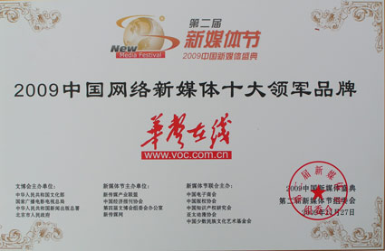 華聲在線榮獲“2009中國(guó)網(wǎng)絡(luò)新媒體十大領(lǐng)軍品牌”獲獎(jiǎng)證書(shū)