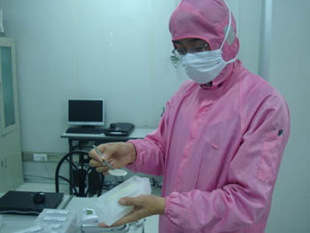 浪潮華光公司科技人員向記者展示外延片。據(jù)介紹,這一塊大約直徑2厘米的外延片,可分離出6萬(wàn)個(gè)LED發(fā)光體,是LED產(chǎn)業(yè)的上游主導(dǎo)產(chǎn)品。本報(bào)記者呂福明/攝 |