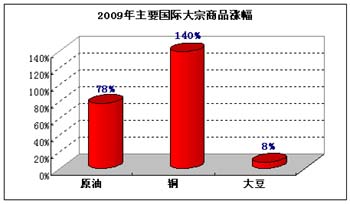 新年鐘聲已經(jīng)敲響;赝艿饺蛘仁姓叻龀值2009年,以原油為代表的國際大宗商品價(jià)格走出了低谷,上演出了一波可觀的止跌反彈行情。 統(tǒng)計(jì)顯示,2009年全年紐約NYMEX原油期貨價(jià)格自年初的每桶44美元左右升至年底的每桶80美元一線,漲幅接近80%。而對宏觀經(jīng)濟(jì)更加敏感的基本金屬漲幅更為明顯,倫敦LME銅期貨價(jià)格自年初的每噸3080美元漲至年底的7405美元,漲幅高達(dá)140%。農(nóng)產(chǎn)品則相對穩(wěn)定。以大豆為例,芝加哥CBOT大豆期貨年終價(jià)格每蒲式耳1048美分較年初的每蒲式耳972美分變化不大,漲幅僅為8%;若以年內(nèi)最高點(diǎn)1291美分計(jì)算,最大漲幅為33%。(見上圖) 經(jīng)過一年的止跌反彈,國際大宗商品2010年又會以什么樣的方式演繹呢?從宏觀經(jīng)濟(jì)、供需情況,以及市場流動性問題等方面綜合分析,筆者預(yù)計(jì)2010年上半年商品高位震蕩的可能性較大,后期隨著全球經(jīng)濟(jì)情況的進(jìn)一步好轉(zhuǎn),則有望再攀新高,不排除農(nóng)產(chǎn)品在2010年出現(xiàn)補(bǔ)漲可能,但需注意中、美等國何時(shí)收縮流動性。這將極大的影響大宗商品上升的勢頭。