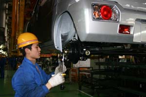 在昌河汽車日產(chǎn)400余輛的繁忙生產(chǎn)線上,工人們正在一絲不茍地安裝、緊固每一個零部件。記者 吳華國/攝 |