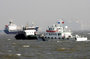 2010年3月14日,一些船舶航行在上海長(zhǎng)江口外高橋碼頭水域。當(dāng)日,國(guó)家“十一五”重點(diǎn)工程、我國(guó)最大的水運(yùn)工程長(zhǎng)江口深水航道三期治理工程通過交通運(yùn)輸部的驗(yàn)收。新華社記者 陳飛 攝