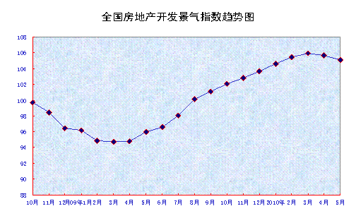 5月份,全國房地產(chǎn)開發(fā)景氣指數(shù)(簡稱“國房景氣指數(shù)”)為105.07,比4月份回落0.59點,比去年同期提高9.13點。