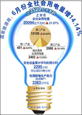 6月份,全社會(huì)用電量3520億千瓦時(shí),同比增長(zhǎng)14.14%,增速比5月份下降6.66個(gè)百分點(diǎn),環(huán)比增長(zhǎng)1.1%。1至6月,全社會(huì)用電量20094億千瓦時(shí),同比增長(zhǎng)21.57%。從分類用電量看,第一產(chǎn)業(yè)451億千瓦時(shí),增長(zhǎng)5.61%;第二產(chǎn)業(yè)15155億千瓦時(shí),增長(zhǎng)24.24%;第三產(chǎn)業(yè)2086億千瓦時(shí),增長(zhǎng)16.19%;城鄉(xiāng)居民生活用電2402億千瓦時(shí),增長(zhǎng)13.93%。 記者注意到,單月同比增長(zhǎng)14.14%是今年各月同比增速中最緩的,今年前5個(gè)月已經(jīng)連續(xù)維持了20%以上的同比增速。 國(guó)家電網(wǎng)能源研究院副院長(zhǎng)胡兆光表示,從6月的用電量增速減緩看來(lái),我國(guó)經(jīng)濟(jì)正在做一個(gè)理性的回歸,“之前連續(xù)數(shù)月20%以上的增速在歷史上是罕見(jiàn)的,去年上半年的基數(shù)較低是主要原因,在中央一攬子計(jì)劃刺激下,2009年6月用電量同比增速正式轉(zhuǎn)正,所以會(huì)造成今年用電量增速前高后低的情況,”胡兆光告訴《經(jīng)濟(jì)參考報(bào)》記者。 6月全社會(huì)用電量的同比增速是14.14%,胡兆光認(rèn)為到今年底還會(huì)繼續(xù)釋放回歸,增速還會(huì)往下走。“如果到了年底大家發(fā)現(xiàn)用電量月度增幅在2%至6%之間,也不要覺(jué)得奇怪和可怕,政府在金融危機(jī)期間做了一些大的手段調(diào)控使得用電量出現(xiàn)了較大的波幅,往后的增幅逐步減小正好表明了中國(guó)經(jīng)濟(jì)逐步趨穩(wěn)!焙坠庹f(shuō)。 國(guó)家倡導(dǎo)并嚴(yán)格執(zhí)行的節(jié)能減排政策被眾多專家認(rèn)為是包括眾多高耗能行業(yè)在內(nèi)的重工業(yè)用電量增速環(huán)比下降較多的一個(gè)重要原因。 華北電力大學(xué)校長(zhǎng)助理張粒子教授告訴《經(jīng)濟(jì)參考報(bào)》記者,“前一陣國(guó)家嚴(yán)格執(zhí)行對(duì)高耗能企業(yè)的差別電價(jià)政策對(duì)重工業(yè)的用電量有一定影響,政府對(duì)一些高耗能產(chǎn)業(yè)的宏觀調(diào)控手段初見(jiàn)成效”。 中投顧問(wèn)能源行業(yè)首席研究員姜謙認(rèn)為,目前是實(shí)現(xiàn)“十一五”期間單位GDP能耗下降20%目標(biāo)的關(guān)鍵時(shí)期,各部委相繼出臺(tái)多項(xiàng)舉措,對(duì)鋼鐵、有色、電力、建材、石化等重點(diǎn)行業(yè),采用取消優(yōu)惠電價(jià)、執(zhí)行差別電價(jià)、加大對(duì)高耗能企業(yè)關(guān)停力度等多種手段加以抑制!按送,寧夏、四川、浙江等多個(gè)省區(qū)自6月1日起相繼取消對(duì)高耗能行業(yè)的優(yōu)惠電價(jià),由此必然導(dǎo)致區(qū)內(nèi)高耗能企業(yè)減少用電量。這也是6月份全國(guó)重工業(yè)用電量同比增速大幅回落的重要因素!苯t告訴《經(jīng)濟(jì)參考報(bào)》記者。 電監(jiān)會(huì)研究室的吳疆研究員提醒《經(jīng)濟(jì)參考報(bào)》記者,不要光看重工業(yè)的用電量增速減緩這一個(gè)數(shù)據(jù),“重工業(yè)用電量絕對(duì)量和占全社會(huì)用電量比例的環(huán)比下降,更可以說(shuō)明一些問(wèn)題! 記者比較了5月份的《全國(guó)電力工業(yè)統(tǒng)計(jì)數(shù)據(jù)》,在6月份全國(guó)全社會(huì)用電量、第一產(chǎn)業(yè)、輕工業(yè)、第三產(chǎn)業(yè)、城鄉(xiāng)居民生活全面較5月份正增長(zhǎng)的情況下,6月的重工業(yè)用電量絕對(duì)量環(huán)比下降17億千瓦時(shí),占全社會(huì)用電量比例環(huán)比下降1.22%。