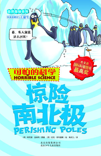 《可怕的科學·驚險南北極》封面 | 叫板《十萬個為什么》的洋科普《可怕的科學》引進版書籍在中國出版,與中式科普讀物問答式的灌輸結(jié)構和教科書風格反差很大,傳統(tǒng)科普讀物面臨強烈的挑戰(zhàn)。 在四、五年前,幾乎還是《十萬個為什么》一統(tǒng)天下的局面,好幾代人都是看著《十萬個為什么》長大的。但《可怕的科學》在一年內(nèi)暢銷3百萬冊,在多元科普知識資訊的時代,顯示了它的競爭力。 在今年的上海書展上,各種各樣紛繁復雜的科普圖書就是一個明證。僅在以中國紅為主基調(diào)的一個展區(qū),就集中陳列了14家出版單位的16000余種科普圖書。 眾多科普圖書的風起云涌,出現(xiàn)了一股科普讀書熱。隨著人們的生活越來越講究科學,少兒科普在整個少兒圖書市場所占份額越來越大,并使少兒科普市場逐漸成熟。不過,在那些科普圖書中,數(shù)量是上來了,質(zhì)量卻沒有提高。在那些科普圖書中,引進版多,本地科普少;跟風拼湊的多,原創(chuàng)佳作少。 《可怕的科學》曾三獲世界科普圖書最高獎――安萬特獎。這次北京出版集團公司首先推出的是“經(jīng)典科學”和“自然探秘”系列!敖(jīng)典科學”總共20種,涉及到物理學、化學、生物學等學科,采用了《能量怪物》、《觸電驚魂》、《時間揭秘》、《聲音的魔力》等可愛卻瘋狂的名字。 中國科普研究所高士其基金會秘書長高志其先生說,家父高士其先生畢生都為繁榮我國的科普創(chuàng)作而不懈努力著。從這套系列讀物中,你能知道,植物也是有感覺的;數(shù)學不再是毫無感情的冷血;鯊魚和細菌,都可能讓這個世界既有的運行模式發(fā)生改變;有一些看似淺顯的技能,學會了,可以受用一生。