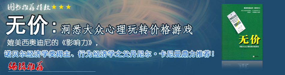 在某種程度上,價格心理學(xué)就是生活心理學(xué),所以,本書里的經(jīng)驗教訓(xùn),其實也就是生活的經(jīng)驗教訓(xùn)。龐德斯通對我們行為里的非理性怪事做了有趣的描述,極具啟發(fā)意義。想買或賣什么東西的時候,千萬記得帶上它。說不定,它能幫你省下一大筆呢。 |