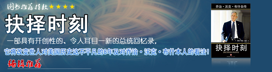 戒掉酒癮、在得克薩斯政府工作——等等這一切,都在《抉擇時刻》這本敘述他八年就職生涯的回憶錄中有了合適的解讀。在此書當中的布什呈現(xiàn)了這樣一個平和、樂于協(xié)商、通情達理、思維開放、值得信賴,同時虔誠敬神、忠誠愛國的形象。 |