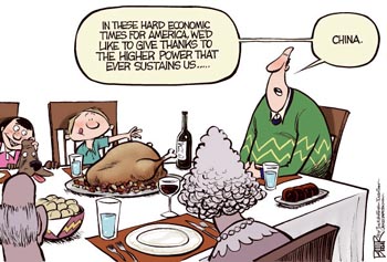 這個(gè)經(jīng)濟(jì)不景氣的感恩節(jié),我們需要感恩中國。(摘自美國政治漫畫網(wǎng))