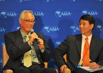反貿(mào)易保護主義事關全球經(jīng)濟復蘇。4月10日,博鰲亞洲論壇“貿(mào)易保護主義:全球經(jīng)濟脆弱復蘇的現(xiàn)實威脅”主題午餐會在海南博鰲舉行。圖為新加坡前總理、國務資政吳作棟(左)在發(fā)言。新華社記者 郭程/攝 |