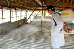9月18日,防疫部門工作人員在番禺區(qū)思賢村一鴨場噴灑防疫消毒藥水。新華社記者:周文杰 攝