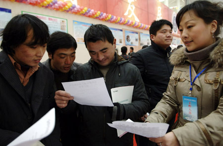 1月15日,“阜陽(yáng)市2009年返鄉(xiāng)農(nóng)民工招聘洽談會(huì)”在安徽阜陽(yáng)舉行。圖為幾位返鄉(xiāng)農(nóng)民工在招聘會(huì)上了解企業(yè)用工信息。新華社記者:李健
