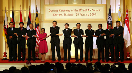 前不久,在第十四屆東盟首腦會議開幕式上,東盟國家首腦手拉著手,向世界表示東盟是友好、合作、堅(jiān)強(qiáng)的團(tuán)體。新華社記者:張鳳國