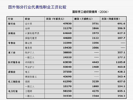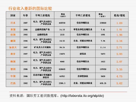 與國際相比,日本最高比值是1.69倍,英國是1.91倍,法國1.96倍,德國2.23倍,加拿大2.71倍,巴西比較高是5.62倍。我們總是擔(dān)心中國陷入拉美式的經(jīng)濟陷阱,然而,根據(jù)國家統(tǒng)計局發(fā)布的今年第一季度最新行業(yè)平均工資數(shù)據(jù),可以計算出我國收入最高的行業(yè)是證券業(yè),是全國平均水平的5.9倍,金融業(yè)是平均工資的3倍。而較低的木材加工業(yè)只有全國平均水平的53.6%,紡織業(yè)是全國平均水平的55.5%,農(nóng)副產(chǎn)品是60.1%,最高與最低行業(yè)平均工資之比是11比1,遠(yuǎn)遠(yuǎn)超過巴西。