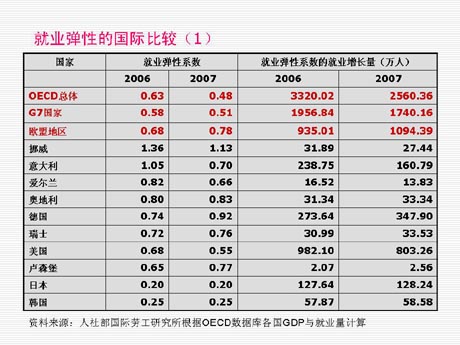 再和國際上進行比較,根據(jù)人力資源和社會保障部國際勞工研究所對OECD數(shù)據(jù)庫和各國GDP就業(yè)量的計算,一般發(fā)展中國家就業(yè)彈性平均在0.3-0.4,發(fā)達國家2007年歐盟地區(qū)總就業(yè)彈性是0.78,OECD國家是0.48。這說明我們這種經(jīng)濟增長方式對帶動就業(yè)的促進作用,與發(fā)達國家相比差太多了,中國基本上是全世界就業(yè)彈性最低的國家。