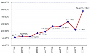 房地產(chǎn)關(guān)系到千家萬戶,關(guān)系到很多年輕人的基本生存需要,連續(xù)多年的房地產(chǎn)價格快速上漲引起了越來越廣泛的社會關(guān)注。在這里,我不打算談房價是漲還是跌,而是想從一個不同的角度來探討,到底怎樣看待房地產(chǎn)業(yè)的性質(zhì)?它的經(jīng)濟(jì)后果是什么?它的社會后果又是什么?最后我提幾點政策建議。 房地產(chǎn)業(yè)涉及的范圍很廣,是巨大的財富“吸金器”。從一個特定的時間截面上來說,購房會涉及到年輕夫婦雙方的父母,甚至雙方的爺爺奶奶,還有雙方的親戚朋友;從時間跨度上來說,房地產(chǎn)通常會涉及到一對夫婦過去幾年甚至更長時間的差不多所有的積蓄,同時也會涉及到他們未來十幾年甚至更長時間的收入(銀行按揭把他們未來的預(yù)期收入折現(xiàn)到現(xiàn)在的房子里)。 同時,房地產(chǎn)業(yè)涉及的資源金額很大,是規(guī)模最大的單項商品。2009年商品房年銷售額預(yù)計會達(dá)到5.8萬億(圖1)。此外,從老百姓的開支來看,2009年房地產(chǎn)消費占居民消費的比例預(yù)計達(dá)到48.33%,接近一半(圖2)。也就是說,房地產(chǎn)對經(jīng)濟(jì)社會、對老百姓等方方面面來說,都是一件很大的事情。 房地產(chǎn)把中低收入階層老百姓的財富基本吸光了,現(xiàn)在很多人變成了“房奴”。這大大加劇了業(yè)已存在的收入分配的不平衡。從1992年到2008年期間,如果把1992年標(biāo)準(zhǔn)化為100,則2008年農(nóng)村人均純收入是607,城鎮(zhèn)人均可支配收入是779,城鎮(zhèn)+農(nóng)村的人均收入是870,而財政的收入(預(yù)算內(nèi))是1761,財政收入的增長幅度超出居民收入增長幅度的兩倍。