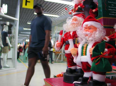 11日,在南非約翰內(nèi)斯堡的東方商城,購(gòu)物者走過(guò)產(chǎn)自浙江義烏的圣誕老人玩偶。南非的圣誕禮品市場(chǎng)現(xiàn)已進(jìn)入最紅火的銷(xiāo)售階段,中國(guó)制造的圣誕禮品因?yàn)槲锩纼r(jià)廉、品種多樣而受到當(dāng)?shù)叵M(fèi)者歡迎。 |