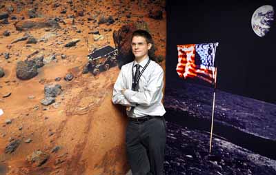 18日,在美國加利福尼亞州,美國宇航局艾姆斯研究中心戰(zhàn)略商業(yè)發(fā)展部主任克里斯·肯普在1996年拍攝的火星表面照片(左)和1968年拍攝的月球和地球照片(右)前留影。網絡搜索引擎谷歌(Google)將和美國宇航局合作,在網絡上提供美國宇航局發(fā)布的圖片,三維地圖和航天飛機的實時信息。