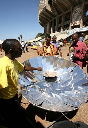 22日,在肯尼亞首都內(nèi)羅畢的世界社會(huì)論壇年會(huì)展示區(qū),國際太陽能炊具非政府組織的工作人員(前)向參觀者介紹太陽能燒飯裝置。該裝置完全利用太陽能加熱,可以用來燒水、煮飯、烤蛋糕等。該組織推廣太陽能炊具旨在提倡人們多使用太陽能以保護(hù)環(huán)境。